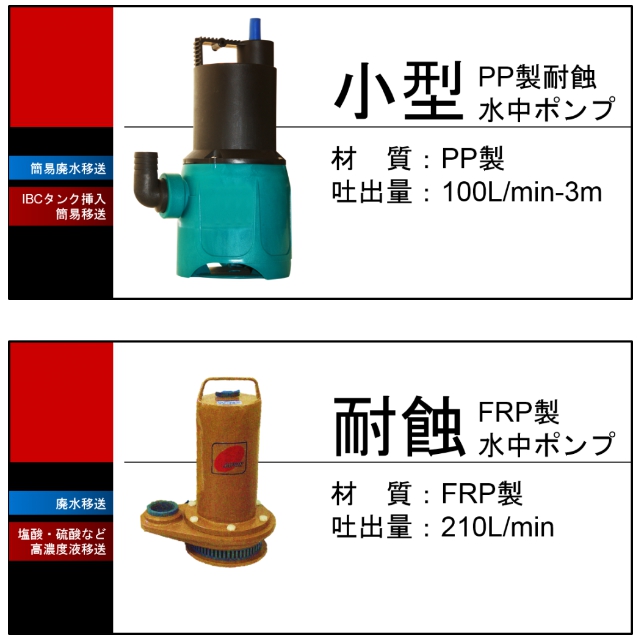 작은 S 시리즈 습식 부품은 PP로 만들어집니다. IBC 탱크에 넣을 수있는 사이징이며 유용성이 뛰어납니다. 모든 FRP로 만들어진 LC 시리즈는 불산 및 강알칼리와 같은 강산과 호환됩니다. 둘 다 플로트 스위치와 함께 사용할 수도 있습니다.