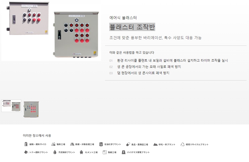 블래스터 조작반은 분사 사이클에 맞추어 자동 분사시키는 것이 가능하고, 무전압 접점을 마련하여 외부 신호를 받아 분사시킬 수 있습니다. 자동 타입은 셀렉트 스위치에 의해 자동과 수동을 전환, 수동으로 단발 분사를 할 수도 있습니다. 블래스터의 대수·실내용·옥외용의 선택·입력 전력 100V/200V의 선택·자동·수동 전환식·수동 전용 등 바리에이션의 넓은 조작반 시리즈로부터 선정을 할 수 있습니다. 특주품의 제작도 하겠습니다.