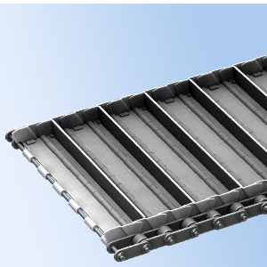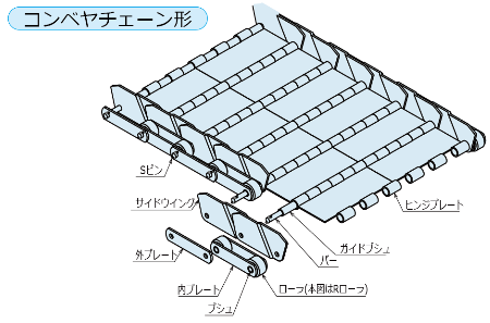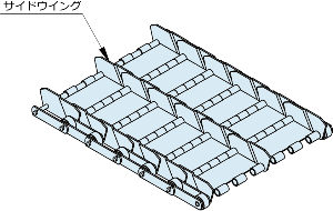| [세세한 장미물 반송에 위력을 발휘] 사이드윙(측판)은 오프셋형으로, 인접하는 사이드윙끼리가 겹치고 있기 때문에, 반송물이 떨어지지 않는 구조로 되어 있습니다. 진행 방향을 반대로 하면 인접하는 사이드 윙의 틈새에 반송물이 들어가 체인이 파손되는 경우도 있으므로 진행 방향에는 주의해 주십시오. |