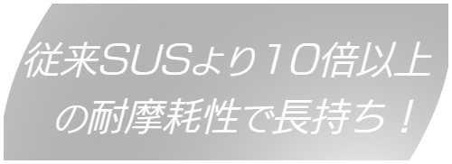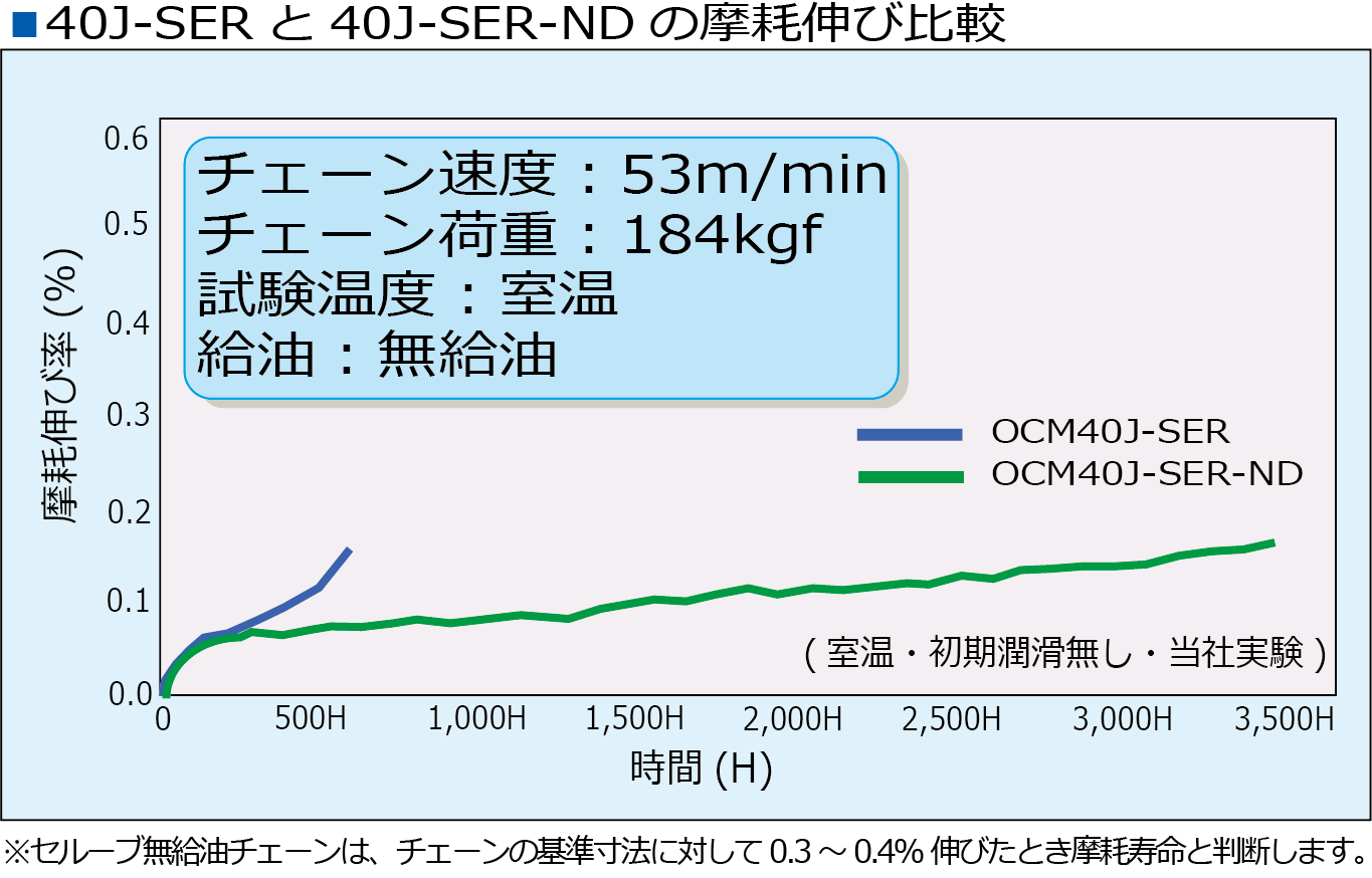 특수 처리를 실시한 ND 셀브(무급유) 체인은, 종래의 셀브(무급유) 체인에 비해 4배 이상, 마모 수명이 향상되었습니다. 체인의 마모 신장이 빨리 교환 빈도가 높아 곤란한 장소나 체인의 급유가 곤란한 장소에서 크게 효과를 발휘합니다.