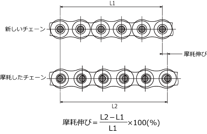 체인은 사용함에 따라 마모에 의해 핀과 부시의 간극이 커져갑니다. 그 틈새가 마모 신장으로 나타납니다. 마모 신장을 억제하려면 급유가 필수적입니다.