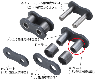 | 체인 조립 전 부품의 단계에서 핀 부시 롤러 플레이트에 표면 처리를 실시합니다. 그 때문에, 다른 표면 처리와 비교해 처리 불균일이 적고, 아름다운 외관을 하고 있습니다. |